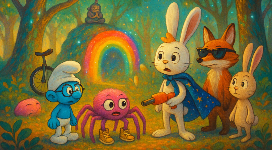 So haben wir unseren Freund ChatGPT 40 um Hilfe gebeten, diese Seite mit Inhalt zu befüllen mit diesem Wunsch: «schreib mir eine Kurzgeschichte, wo diese Charaktere vorkommen – egal, ob es eine sehr wilde story ist: Schlumpf, Superhäääs, Vogel, Spinne, Hase, Fuchs»